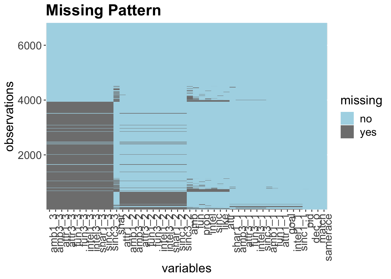 The columns with the most missing data is the questions about the six attributes in expectation (attr:shar) and five attributes in self-evaluation (attr:sinc) answered two weeks after the dating, and they have the same missing patterns because they were asked at the same time. Due to the large number of missings in these columns, we drop questions asked two weeks after the datings in most of our analysis (only include them once to see the change over time). There are 13 more missing patterns in rows, each of which missed only a small part of data, when analyzing these varibles, we would simply filter out the missing data.